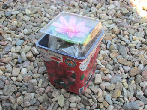 Jelikož jsou rostlinky opravdu malé, nádobu jsem musel v jezírku vypodložit zelinářskou bedínkou.
