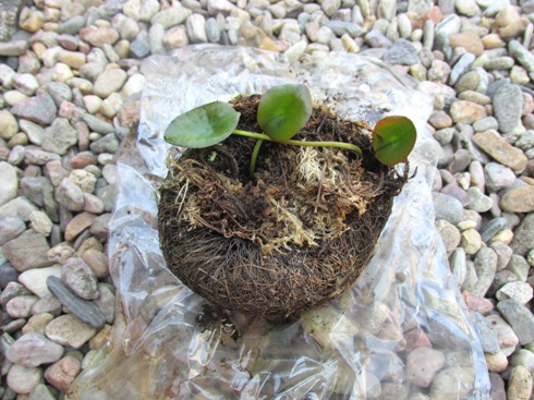 Leknín je obalen rašeliníkem, kokosovým vláknem a ve spodní části je štěrk. Vše je umístěno v plastové síťce.