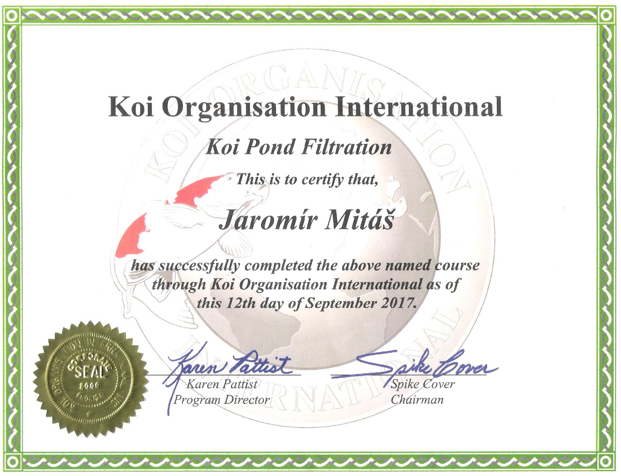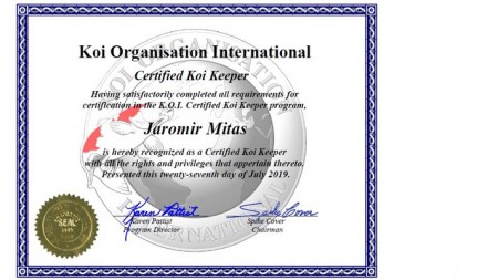 2019 - získání certifikátu od Koi Organisation International (K.O.I.) - Certified Koi Keeper